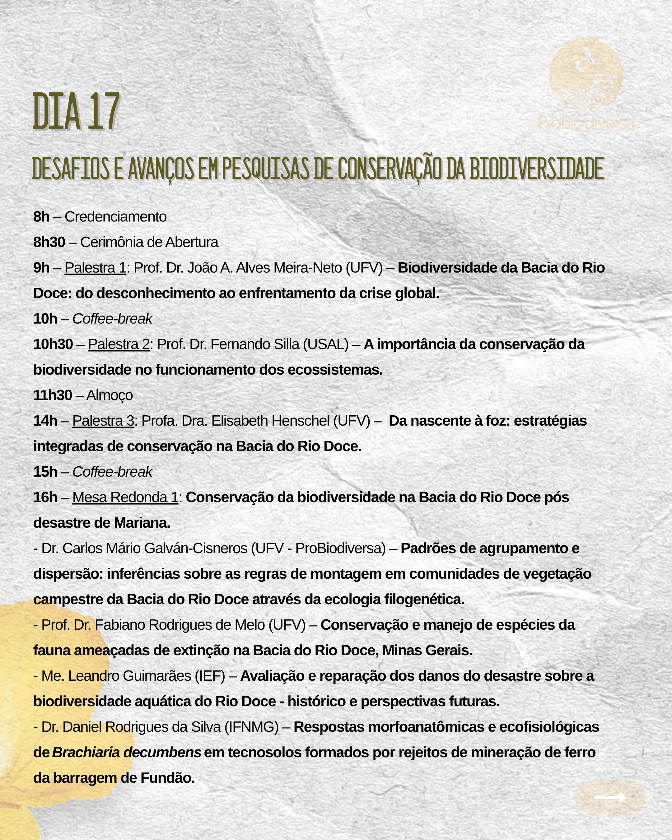 Nosso evento tem o tema “Desafios e Perspectivas para a Conservação na Bacia do Rio Doce” com possibilidade de participação presencial no Auditório da Economia Rural, na Universidade Federal de Viçosa, entre 17 e 19 de novembro, e on-line em nosso canal do Youtube! 🌍 (https://lnkd.in/d5x7F23Y)