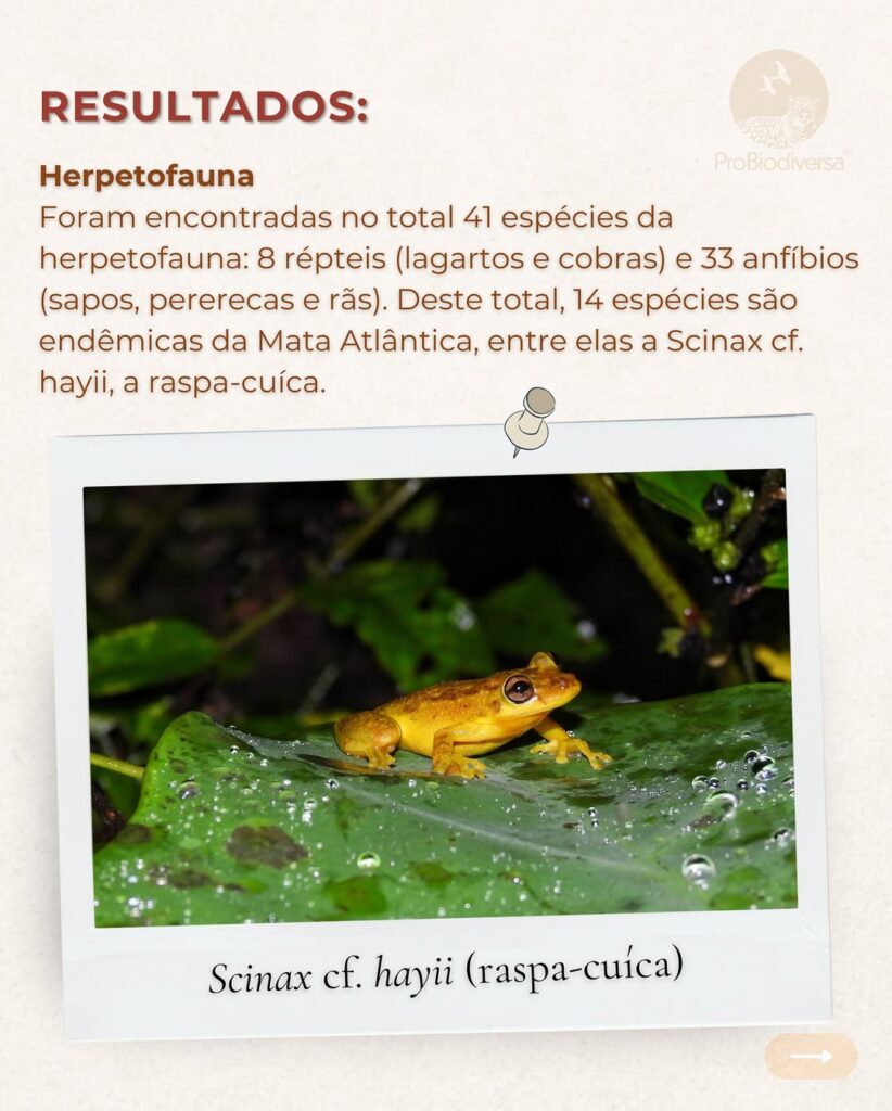 Agora, com o levantamento de fauna finalizado 🎯, temos a alegria de apresentar alguns resultados incríveis 📊, acompanhados de imagens deslumbrantes da biodiversidade de anfíbios 🐸, répteis 🦎, aves 🦜 e mamíferos 🦊.