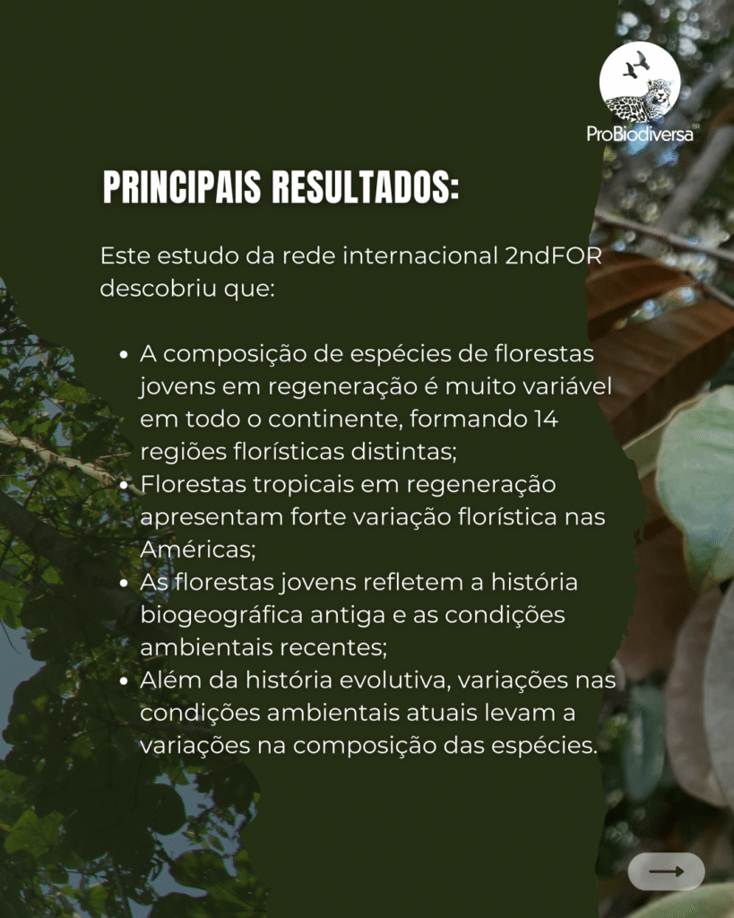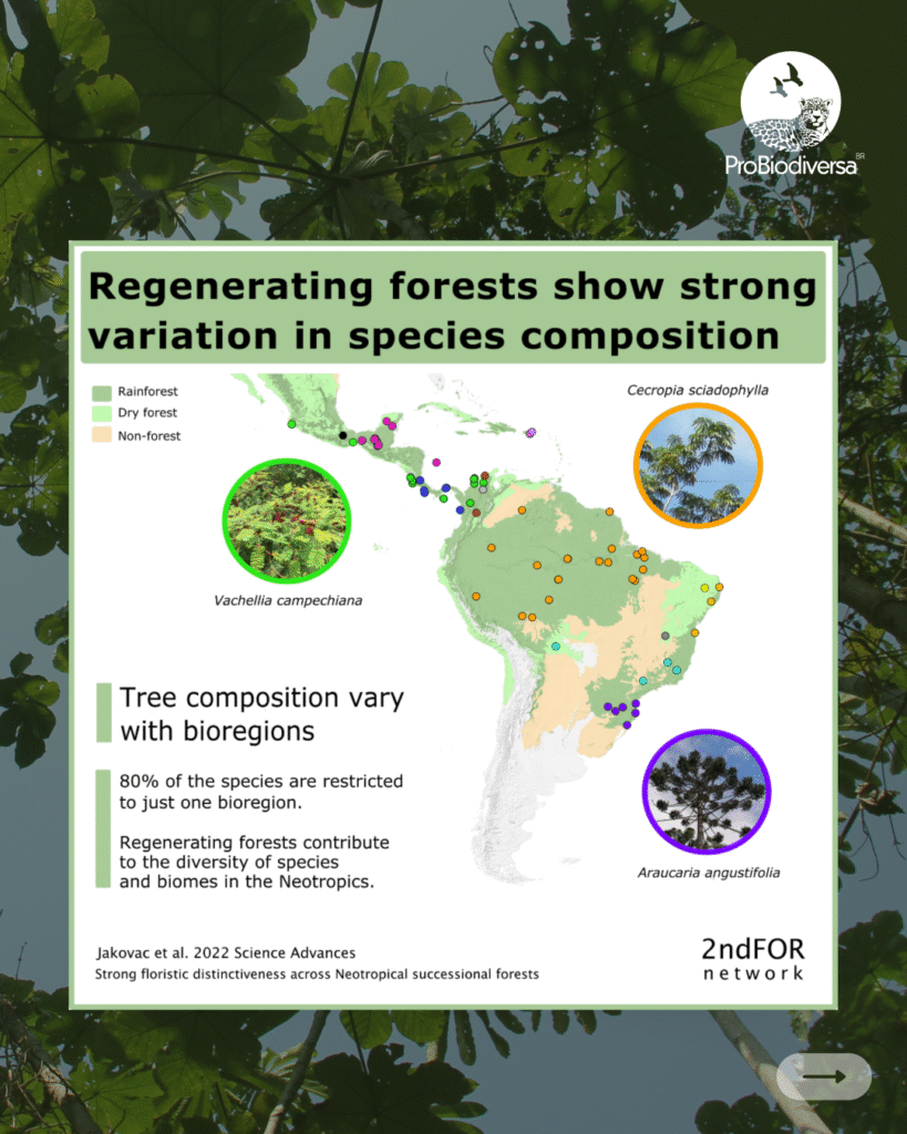 Florestas em regeneração contribuem para a manutenção da diversidade de espécies e biomas nas Américas. Rede 2ndFOR publica estudo na revista Science Advances mostrando que as florestas em processo de regeneração não são todas iguais e podem ajudar a restaurar e conservar as distintas regiões ecológicas das Américas. Foram analisadas 1.215 florestas em processo de regeneração do Oeste do México ao Sul do Brasil. Das 2.164 espécies de árvores encontradas, 80% está restrita a apenas uma região. Estas espécies de distribuição restrita têm papel fundamental na manutenção da diversidade local, regional e continental e devem portanto ser conservadas e promovidas em projetos de restauração.
